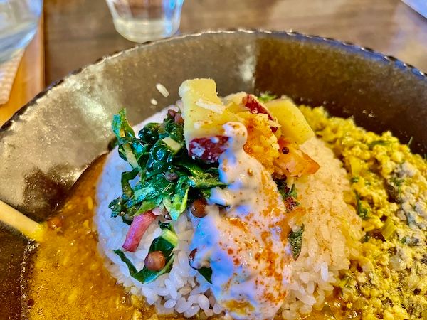 同じカレーには出会ったことないのは野菜自身が主役だから。とはいえエビやホロホロのお肉がたっぷりのカレーもあるのでガッツリ食べたい輩も心配無用です。素材それぞれがしっかり主張しながら共鳴しあっているレシピは店主さんのセンスがなせる技。カレー同士は混ぜずにそのスパイスや味わいを楽しむのがいい気がします(あくまで私見)。