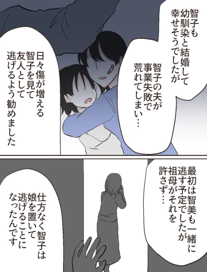 智子さんは結婚当初とても幸せそうでしたが、夫の事業が失敗したことをきっかけに、家庭の雰囲気は一変。夫は次第に荒れ、ついには智子さんに暴力を振るうようになってしまったそうです。日に日に増えていく智子さんの傷を見て、義母は友人として逃げるよう勧めました。はじめは智美さんも一緒に家を出る予定でしたが、祖母がそれを許さなかったようで、智子さんは娘を残して1人で家を出て行きました。