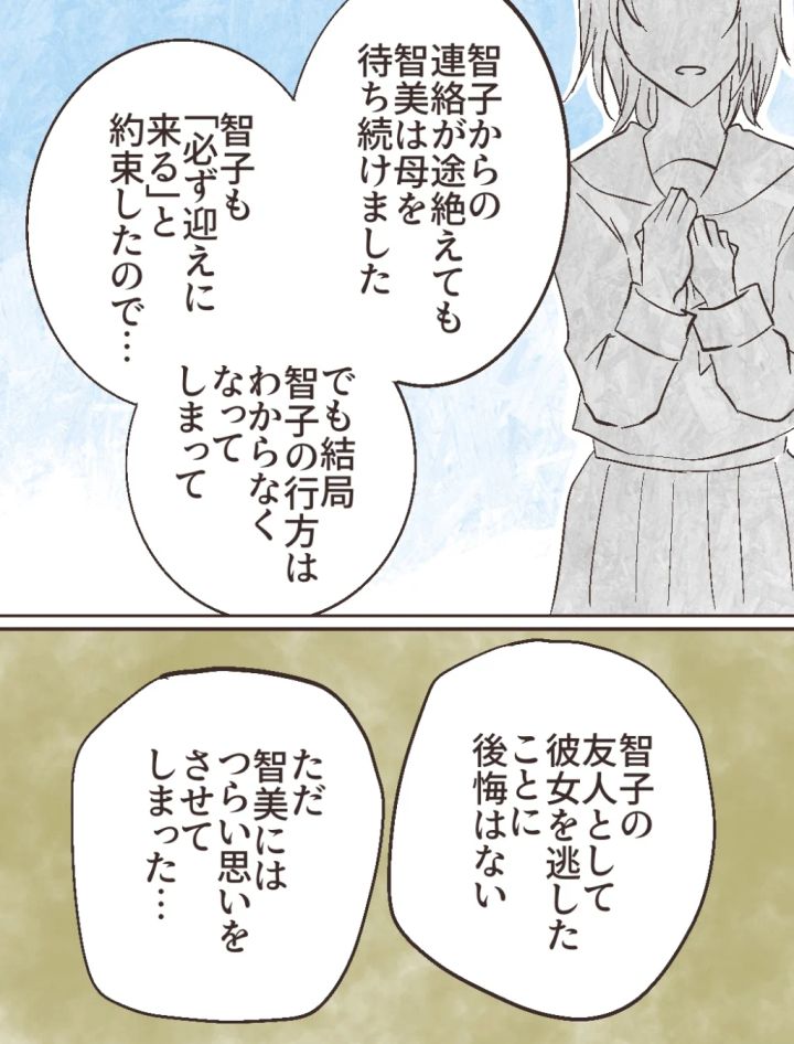 智子さんからの連絡が途絶えても、智美さんは「必ず迎えに来る」という母の言葉を信じ、待ち続けたそうです。しかし、智子さんの行方は今も分からないまま。義母は今にも泣き出しそうな表情で「智子の友人として彼女を逃がしたことに後悔はない、ただ智美にはつらい思いをさせてしまった」と苦しそうに語りました。
