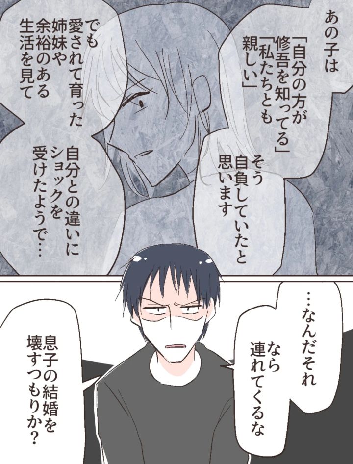 智美さんには「自分のほうが修吾をよく知っている」「家族同然の存在だ」という強い自負があったようです。けれど、両親に愛されて育った私とふみの、そして私たち家族の余裕のある生活を目の当たりにし、その差にショックを受けたのではないかと義母は話しました。それを聞いた修吾は、「なら連れてくるな、息子の結婚を壊すつもりか?」と義母をにらみます。