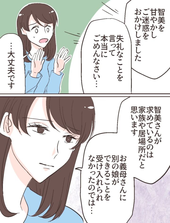 智美さんが求めているのは、家族や居場所。修吾に恋心を抱いていたのではなく、義母に私という『別の娘』ができることが受け入れられなくて、嫌がらせをしたりマウントをとったりしたのではないでしょうか。今までされたことを許せるわけではありませんが、智美さんという人物を知り、彼女の見方が少し変わった気がしました。