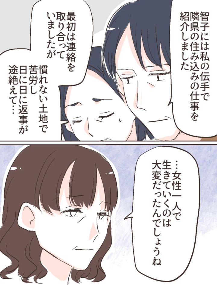 その後、智子さんは義父の紹介で隣県の住み込みの仕事をすることに。最初は連絡を取り合っていたものの、慣れない土地での生活に追われたのか、返事は次第に途絶え、やがて完全に連絡が取れなくなったそうです。その話を聞いた母は、「女性1人で生きていくのは大変だったんでしょうね」と事情を察したように言いました。