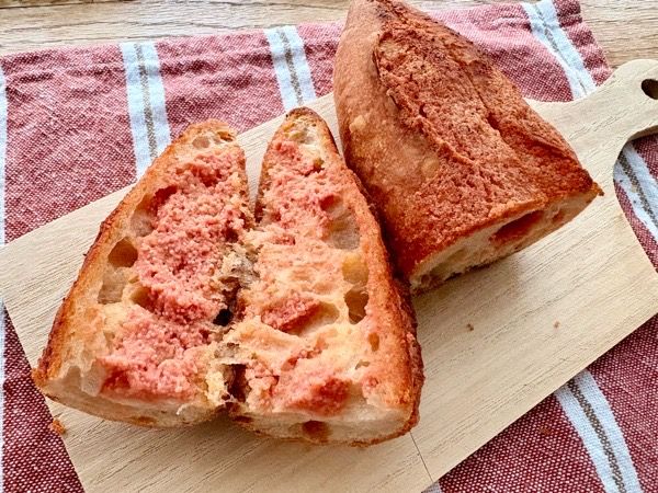 博多明太バゲット(300円) 福岡県産小麦を使った生地に、福岡の有名明太子メーカー「かねふく」さんの明太子を使用とは、店主さんのこだわりを感じさせる一品です。 明太子とバターがたっぷりのフィリングは、ジューシーで、噛み応えのあるバゲットに馴染んで相思相愛の美味しさ。