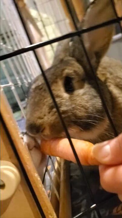 対して、おやつを取っていったウサギはというと・・・ この子は、ニンジンを取り戻されないようにしているのか、ケージの柵から少し離れた場所に移動してニンジンをじっくりとかじっているのでした。