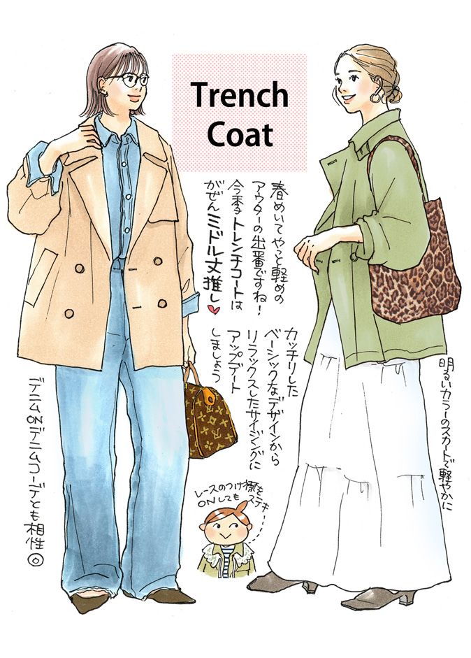 春めいてやっと軽めのアウターの出番ですね!今季のトレンチコートは、がぜんミドル丈推し。カッチリしたベーシックなデザインからリラックスしたサイジングにアップデートしましょう。