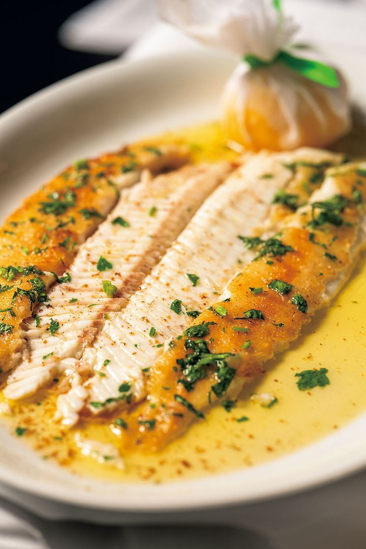 “舌平目のムニエル”62ユーロ(夜67ユーロ)。あっさりとした白身魚とブール・ブランソース、レモンのマリアージュが至高。