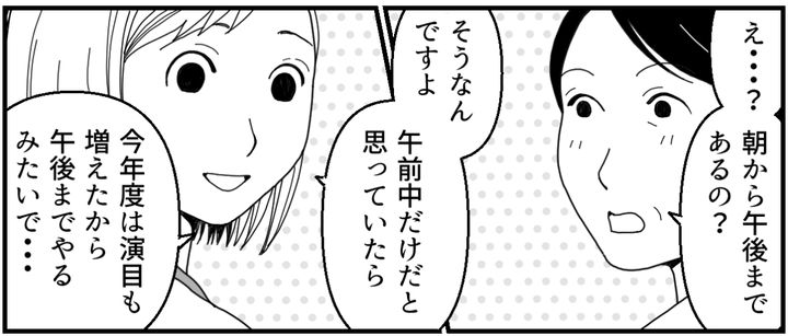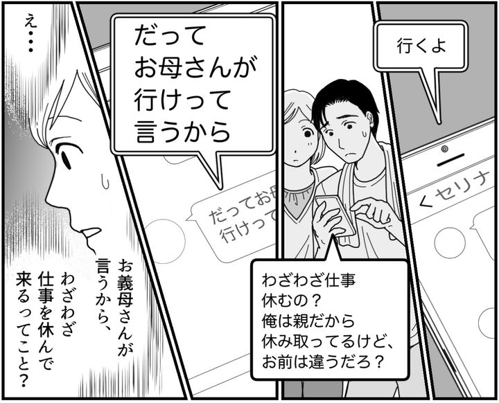 義母はセリナちゃんが来るのは「家族だから当たり前」と言い切っていました。けれどセリナちゃんは立派な社会人。保育園の発表会がある水曜は普通に仕事のはずです。朝から午後まで見るとなったら、一日休まないといけません。