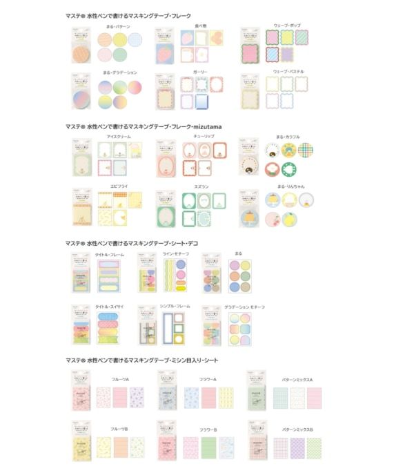 商品・価格: 水性ペンで書けるマスキングテープ・フレーク 715円/6種 ‐ 仕様:5柄 各6枚・合計30枚入 水性ペンで書けるマスキングテープ・フレーク・mizutama 770円/6種 ‐ 仕様:5柄 各4枚・合計20枚入 水性ペンで書けるマスキングテープ・ミシン目入り・シート 880円/6種 ‐ 仕様:3柄 各10枚入り 合計30枚入 水性ペンで書けるマスキングテープ・ミシン目入り・シート・デコ 770円/6種 ‐ 仕様:20枚入