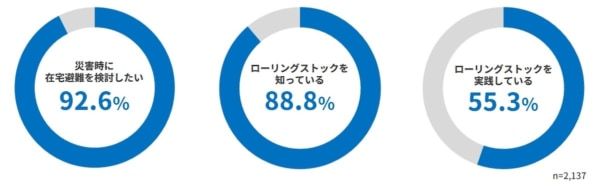 ここまでの調査結果から、大多数の人が「災害時に在宅避難を検討」しており、在宅避難の備えとして効果的な「ローリングストック」の認知度は高いものの、実践している人はその半数程度であることがわかりました。