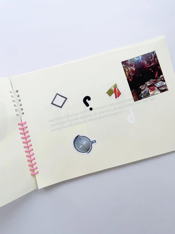 どの破片を見ても、どんな場所で購入したもので、どんなふうにして壊してしまったかが思い出される。破片のほか、3組それぞれのカメラロールにあった「失敗」写真もシールにして収録した。