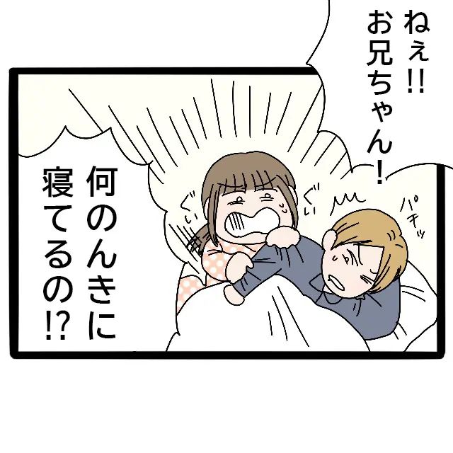 私は急いで兄の寝室へ向かい、「ねぇ、お兄ちゃん!何のんきに寝てるの!?」と彼を叩き起こしました。兄が掃除をやめるよう言えば、みずほ先輩もきっと従ってくれるはずです。私の声に気づいた兄は、迷惑そうにゆっくりと目を開けました。