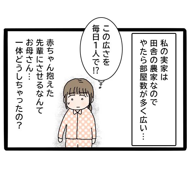 私の実家は田舎の農家で、やたら部屋数が多く、加えて一部屋が広い造りをしています。そんな家を、みずほ先輩が毎日ひとりで掃除していると聞いて驚きました。それにしても、赤ちゃんを抱えた先輩に家中の掃除をさせるなんて・・・うちの母は一体どうしてしまったのでしょうか。