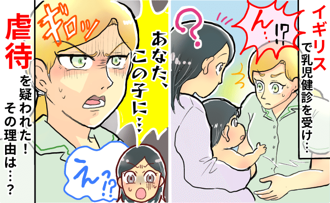 長男が生後5カ月のころ、乳児健診でのことです。担当は白人女性のヘルスビジターでした。ヘルスビジターとは、子ども専門の看護専門職の方です。和やかに始まった健診でしたが、長男の体を見ていた彼女の顔つきが急に険しいものに……。それまでの和やかさが一変し、長男の生活の様子や家族との関わり方を事細かに聞かれ始めました。