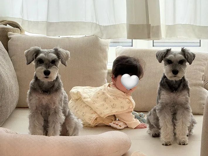 写真には、娘さんの隣で行儀よくおすわりをして、静かに離乳食を待つHugoくんとCocoちゃんの姿が収められていました。