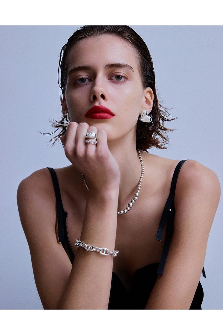 クールで洗練された印象のシルバーは、カジュアルからモードまで幅広いスタイルに対応できる素材。中でもシルバー925は、ゴールドと同じくらいアレルギーが出にくいのもポイント。着用後にさっと水で洗いクロスで軽く磨けばOKと、お手入れのしやすさも◎