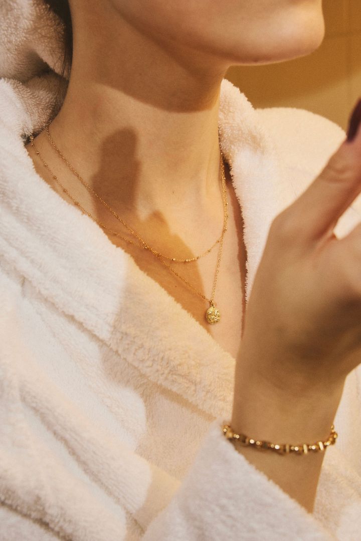 肌なじみがよく、ストレスなく身につけられるネックレスでも、基本24時間つけっぱなしにするのは避けた方がベター。きゃしゃなデザインであるほど、服の着脱時や就寝時の寝返りなどで、ネックレスにダメージを与えてしまうリスクが。入浴や就寝時には外し、日中のつけっぱなしを楽しむのが正解。また、使用後は柔らかい布で軽く拭いて収納するひと手間を加えることが、ジュエリーの輝きを最大限を保つコツ。