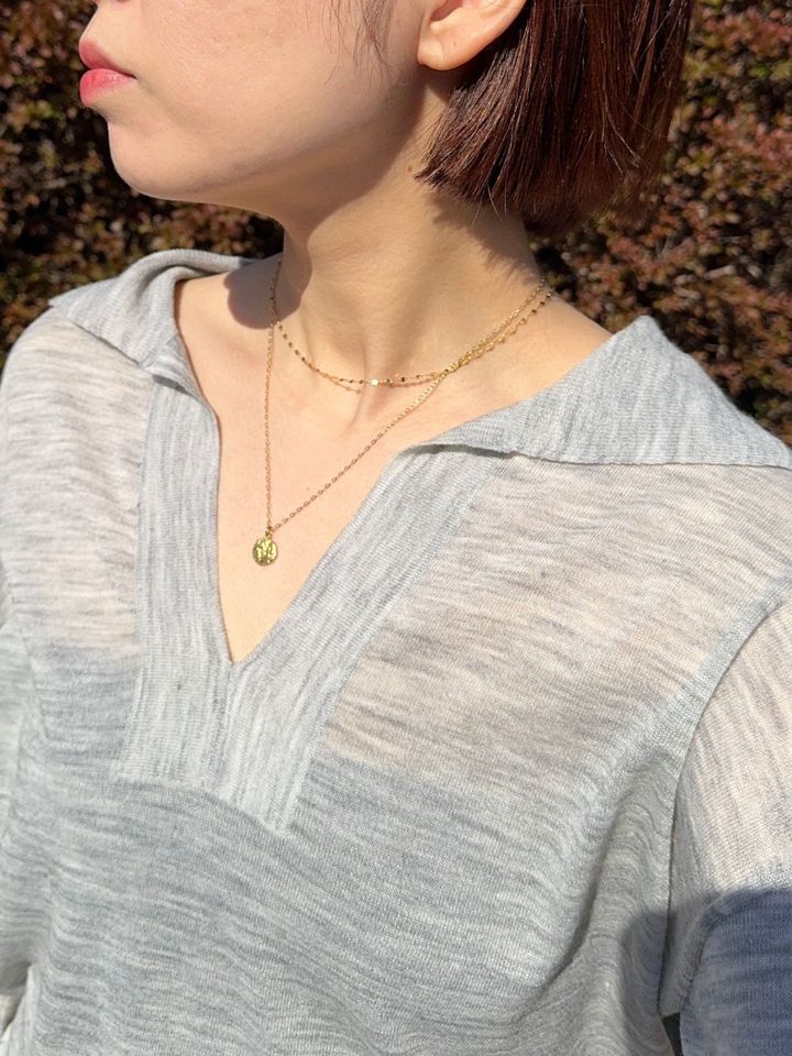 小ぶりでシンプルなモチーフのネックレスが使いやすい。コインネックレスは、オフィスからカジュアルまでシーンを問わずなじみ、重ね付けのベースとしても優秀。チェーン部分とモチーフ部分で素材が異なるアイテムも多いため、パーツごとの素材を確認しておくことも忘れずに。