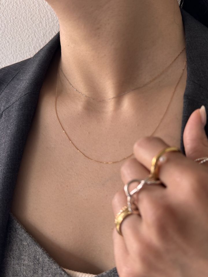 「2本を重ね付けすることが多いです。短い方は、プラチナと10Kイエローゴールドを組み合わせたスキンジュエリー。ミニマルながらさりげない個性があり、ゴールドやシルバーのミックススタイルも美しく調和するところがお気に入り。レイヤードしている50cmのネックレスは、4面カットの喜平チェーンなので、肌に沿ってしなやかに輝き、凛とした印象を与えてくれます。スライドボールつきで、長さ調整が可能なのもうれしいポイント。装いを選ばず楽しめるデザインです」