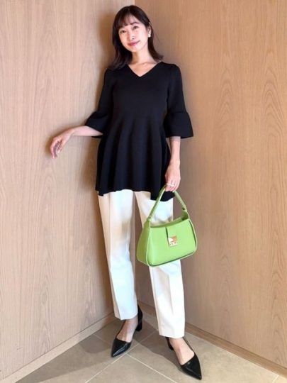 お仕事後に予定がある日は、カラーを取り入れて遊び心をプラス。明るい色味はボトムスで取り入れることで、デスクワークにも馴染み、洗練された印象に。