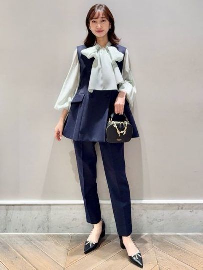 オンラインミーティングで映えるビッグリボンがポイント。顔まわりがパッと華やかになるので、好印象を狙えそう。
