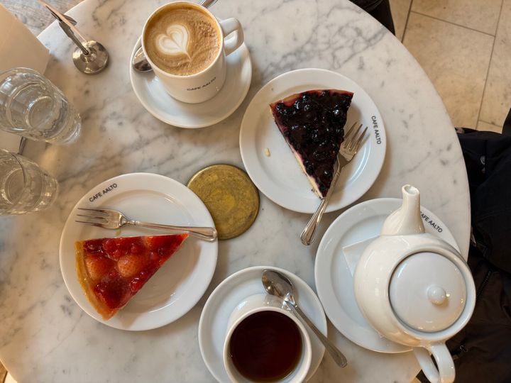ヘルシンキ市内に戻り、アカデミア書店にあるカフェアアルトでコーヒータイム。 ここはかもめ食堂のロケ地として人気なカフェ。運良く席も空いていてラッキー。本屋自体、有名な建築家が作ったそうで、内装もすごかった。