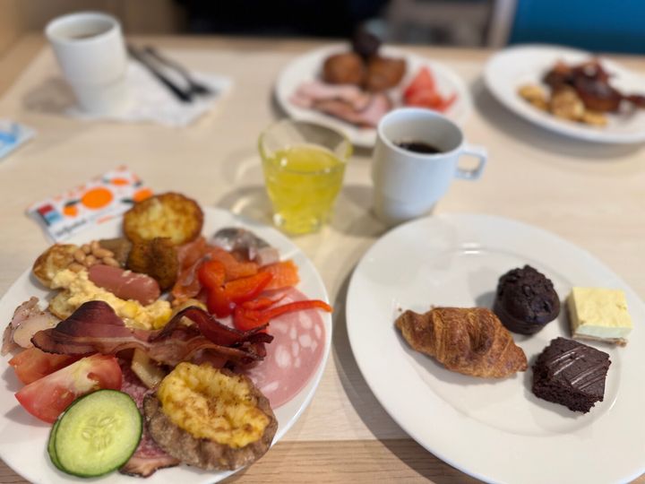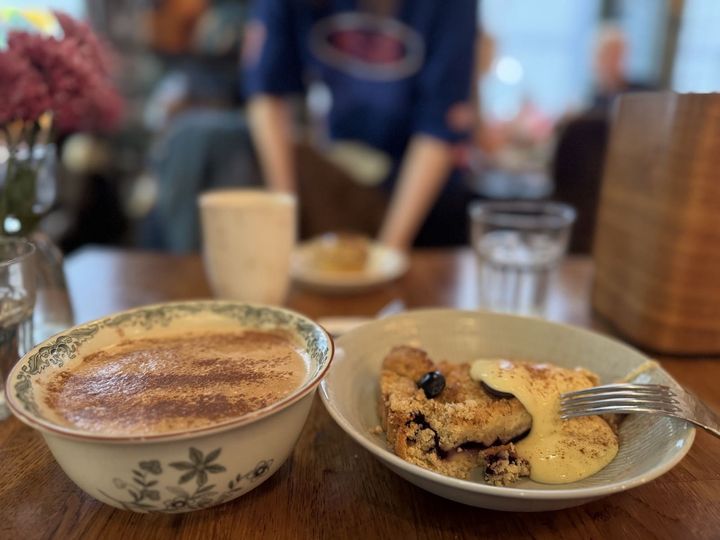 ショーケースに並ぶめっちゃでかいケーキ、そして縦に積まれたサンドイッチ。私はブルーベリーパイとカフェラテを注文したのですが、苦手なシナモンがここぞとばかりに両方にぶっかけられていました。なんとか頑張って食べたけど、ケーキが激甘で朝からちょっと重たかったです。