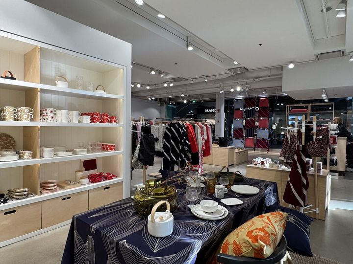 お皿、カトラリー、紙ナプキンもすべてマリメッコ柄。しっかりデザートまで堪能。おなかいっぱいに満たされたあとはショッピング。