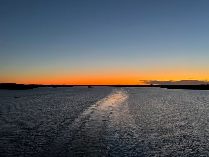 するとBarカウンターに吊り下げられているワイングラスがカタカタと音を立て始めました。どうやらスウェーデンを出発したようです。屋外デッキに出ると、美しいサンセット。