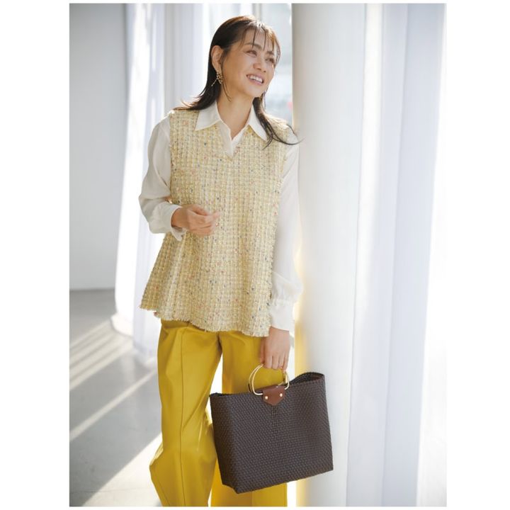 パンツの色とツイードをリンクさせることで、華やかさが程よく中和され、着痩せ効果も狙えます。