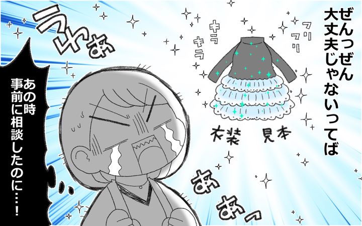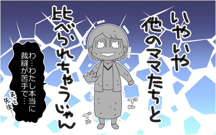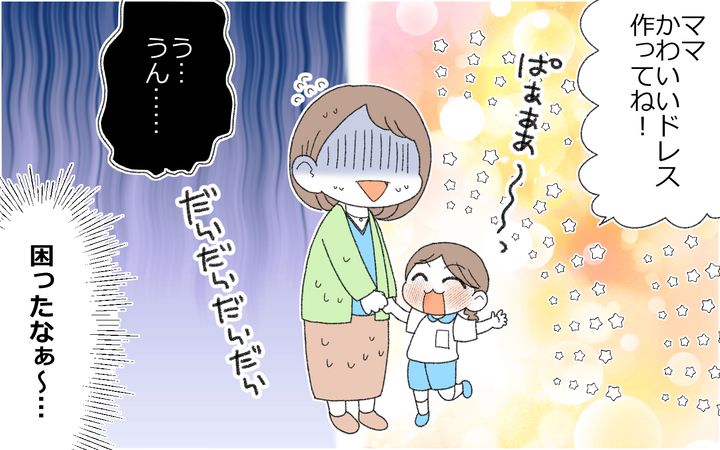 自分が作った残念な衣装のせいで、晴れ舞台で子どもが恥ずかしい思いをするんじゃないかと、焦りと不安が入り混じり…。