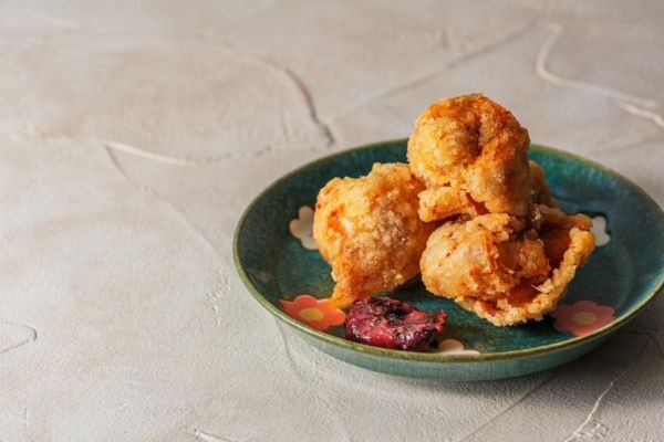 もも肉の中でも特に柔らかい、上もも肉の「あか」と呼ばれる部位だけをつかい、さっぱりと梅味を纏わせた一品。屋号の梅をモチーフにした、まさに「鳥料理梅や」を象徴するからあげです。