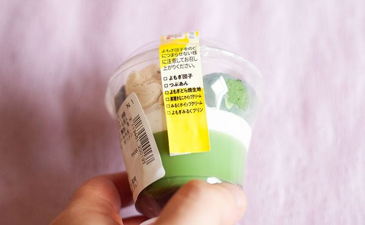 この商品は、つぶあんとよもぎみるくプリン、みるくホイップクリームの上に、よもぎ団子、つぶあん、よもぎどら焼生地、黒糖きなこホイップクリームを盛り付けた、春らしさ全開のパフェ。ご親切に、パッケージ横にも内容が書いてありますね。地味に助かる!
