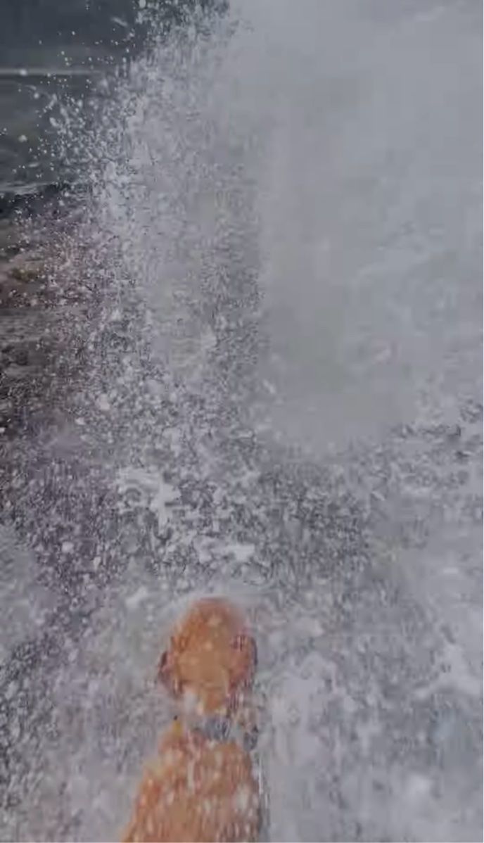 噴水のごとく高々と舞い上がった海水は、穴の外に立っていた撮影者さんたちにザブンと降りかかりました。 その光景は、カメラ越しに見ても非常に豪快かつスリリングなものでした!!