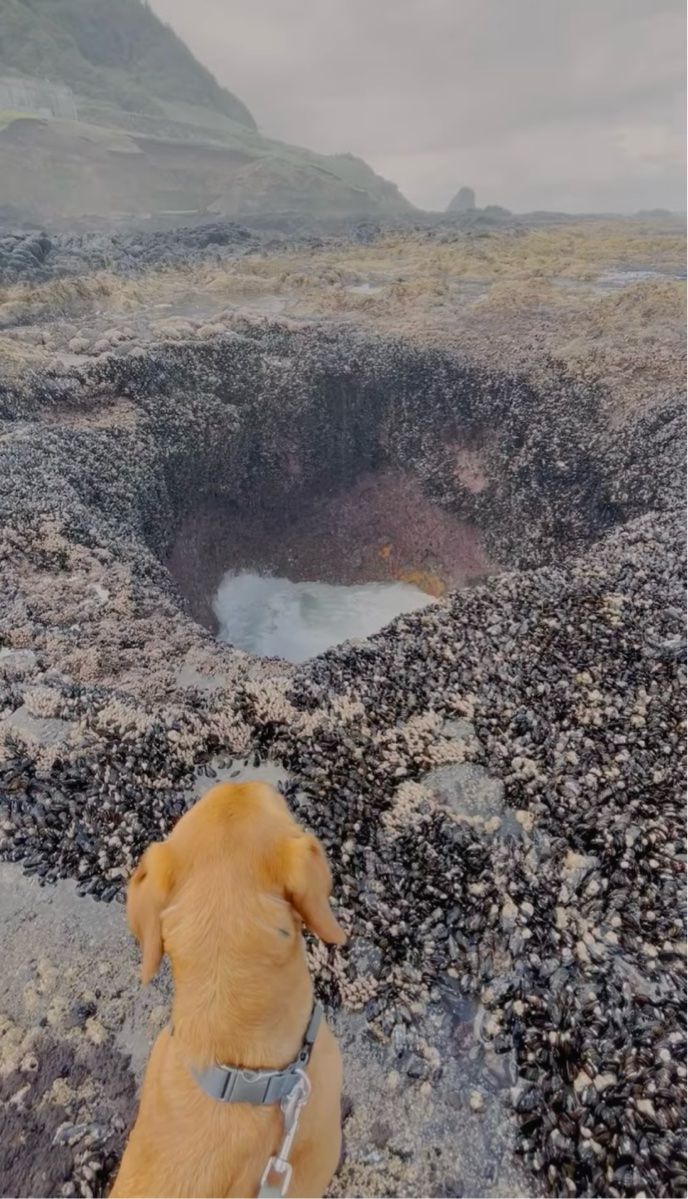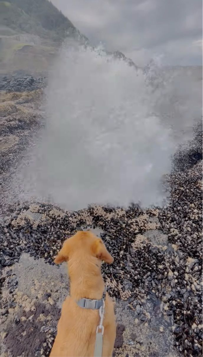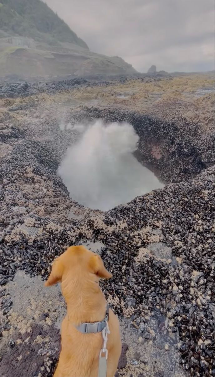 3. 海岸の岩場にできた巨大な穴。愛犬と一緒に近付いたその瞬間・・、海水の噴水が噴き出した!?【アメリカ・動画】