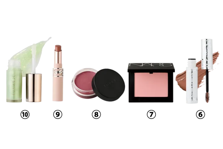 【6】ムースブロウマスカラ 15 2,420円/ジルスチュアート ビューティ【7】ブラッシュ N 903 5,390円/NARS JAPAN【8】グラムトーンカラーカスタード 07 3,300円/THREE【9】YSL ラブヌード リップスティック 01 6,050円/イヴ・サンローラン・ボーテ(4/3発売)【10】ルナソル デューイリフレクトリップオイル EX01 3,850円/カネボウ化粧品(4/24限定発売)