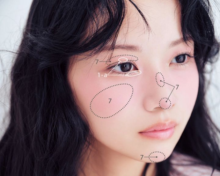 今度は7を小さめのブラシにとり、二重幅より上部にアイシャドウとしてなじませたら、余った分で鼻筋の上、鼻先、あご先にもオン。