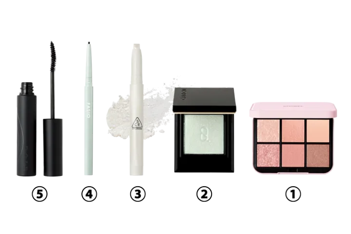 【1】アイデザイナー n 01 6,600円/SNIDEL BEAUTY【2】モノ ルック アイズ P-04 4,290円/SUQQU【3】アイスイッチ スティック ダブルノート 2,189円/3CE【4】ファシオ ペンシル アイライナー 01 1,100円(編集部調べ)/コーセー【5】ケイト ナミダノタテマスカラ(ボリューム)BK-1 1,650円(編集部調べ)/カネボウ化粧品
