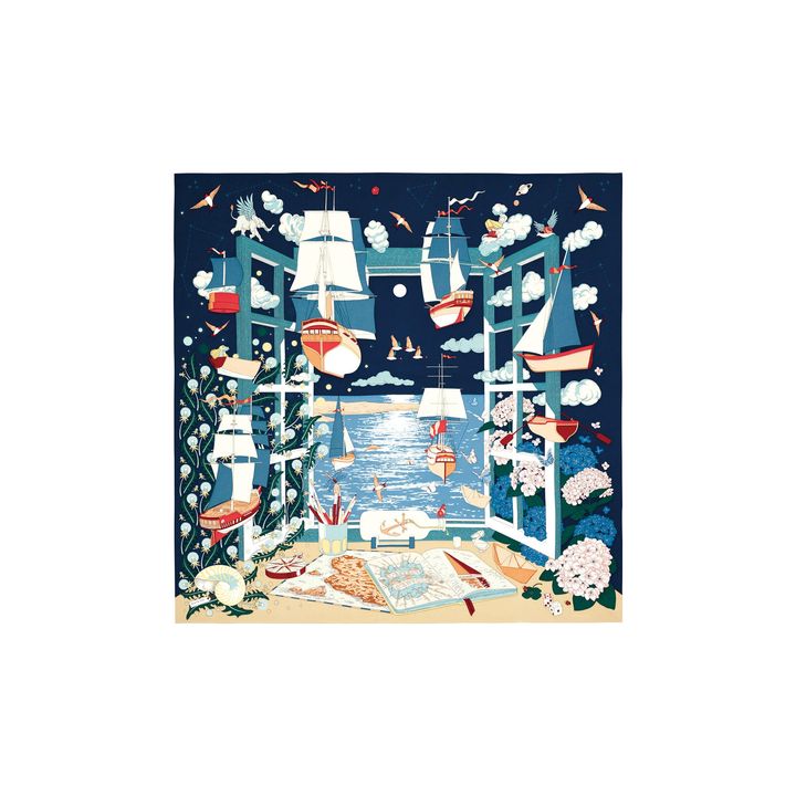 「エルメス」の小物を多く手掛けるアーティスト、ディミトリ・リバルチェンコがデザイン。大海原の冒険へ繰り出す帆船などの様子を描いた、イマジネーション豊かな絵柄を、熟練の職人技で見事に再現しました。程よいハリのある上質なシルクが用いられて、巻いたときにも美しく映えます。
