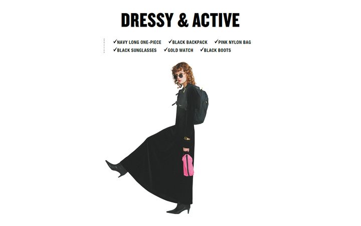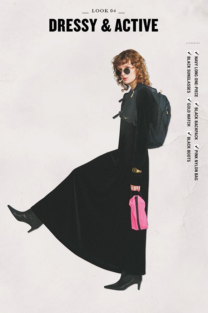 アクティブな小物でカジュアルダウンする常とう手段は、1枚で絵になるフレアワンピースとならより簡単に。大きなバックパックの無骨さも、黒っぽいトーンでそろえれば実用性とスタイリッシュさを両立できる。黒にほど近いネイビーで、フレアワンピースの奥行きを維持。ピンクのナイロンバッグをさし色づかいにプラス。
