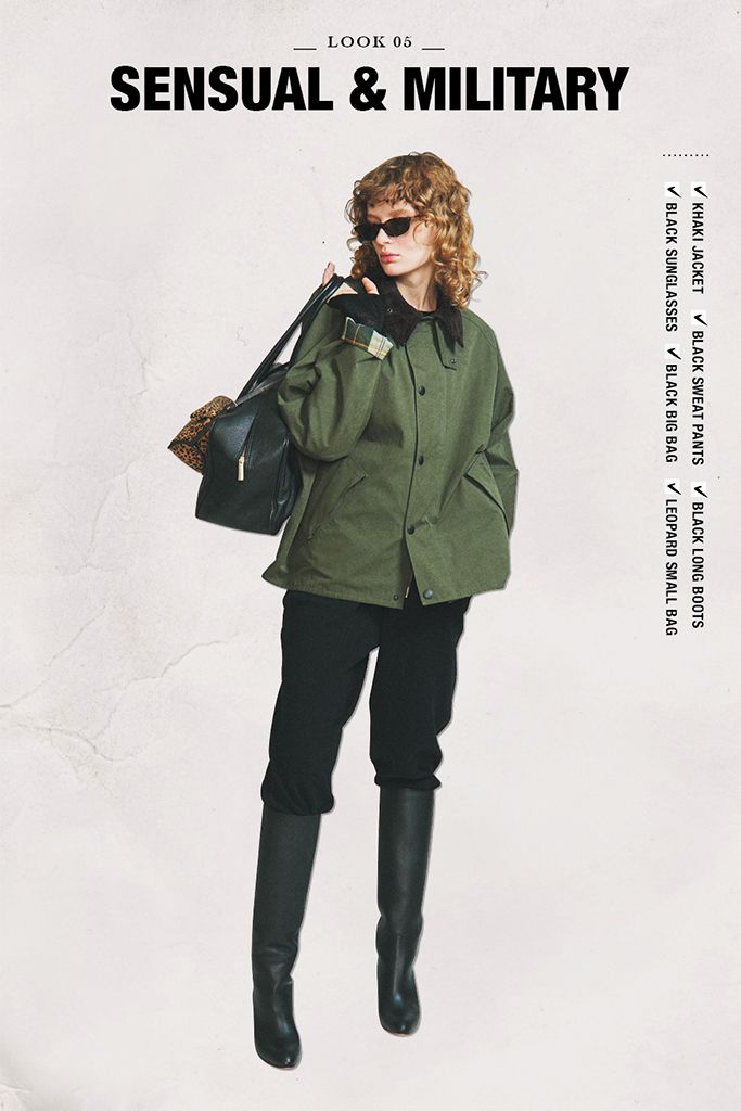 レザーのロングブーツにパンツをIN。確固たる気品とスレンダーなシルエットにより、再燃中のミリタリージャケットを簡単に女性らしく落とし込める。ジャケットは桃の皮の表面のようななめらかな質感の「ピーチスキン素材」。ヴィンテージ感のあるジャケットは、短め丈で軽やかに。