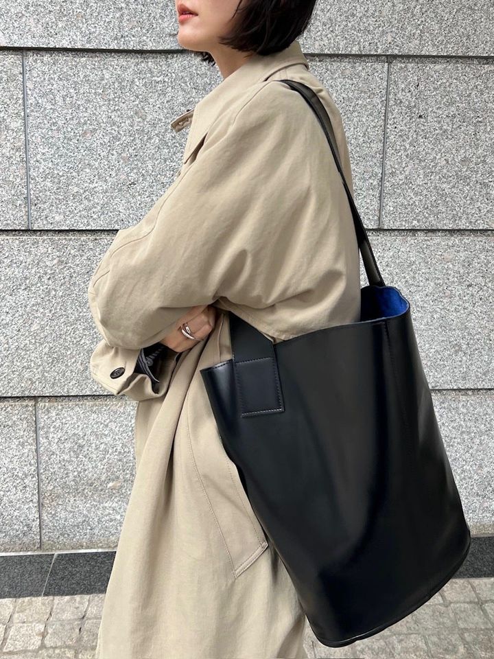 「『イロット』のショルダーバックは、PCがスマートに収まるサイズ感と、荷物の出し入れをスムーズに叶えるバケツ型のフォルムが◎。その圧倒的な機能美に惹かれ、ワークシーンの頼れる相棒として愛用しています。何より心をつかまれるのは、ふとした瞬間にのぞく内側の鮮やかなブルー。シックなたたずまいのなかに遊び心を秘めたコントラストが、コーディネートの洗練されたアクセントになってくれます」