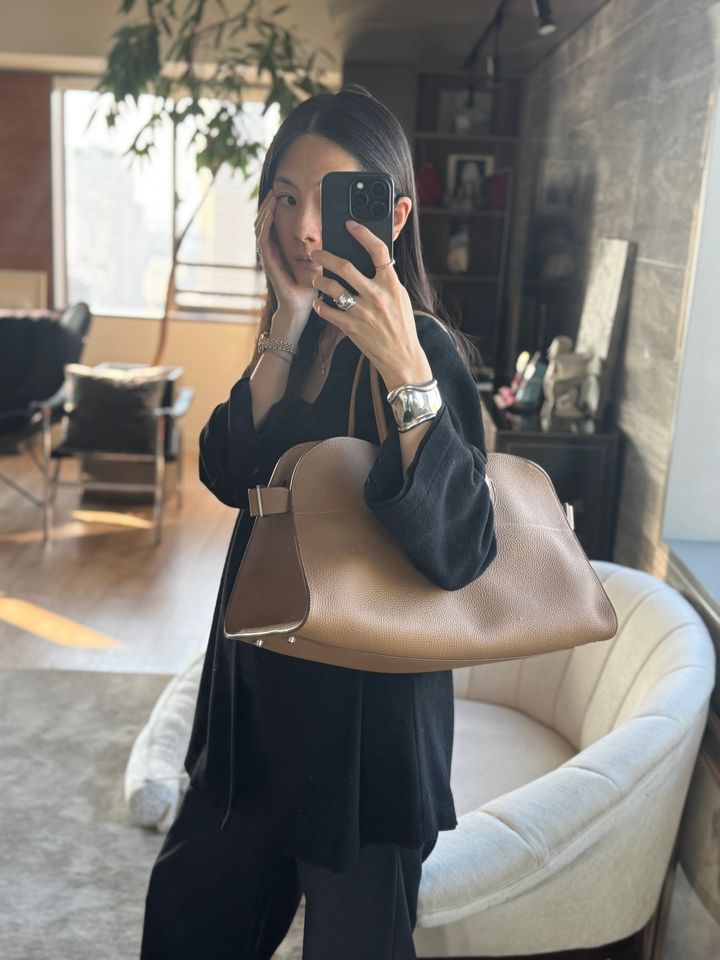 「『ザ・ロウ』のパークトートは、とにかくどんな服装にもしっくりなじむ万能さが◎。持ち手の長さが絶妙で、スムーズに肩がけできる使い心地の良さもお気に入りです。たくさん荷物を入れても形が崩れにくく、きれいなシルエットをキープできるのがうれしいポイント。実用的でラフになりすぎない、まさに“全部が好き!”と言い切れるほど、毎日のコーディネートに欠かせない相棒のようなバッグです」
