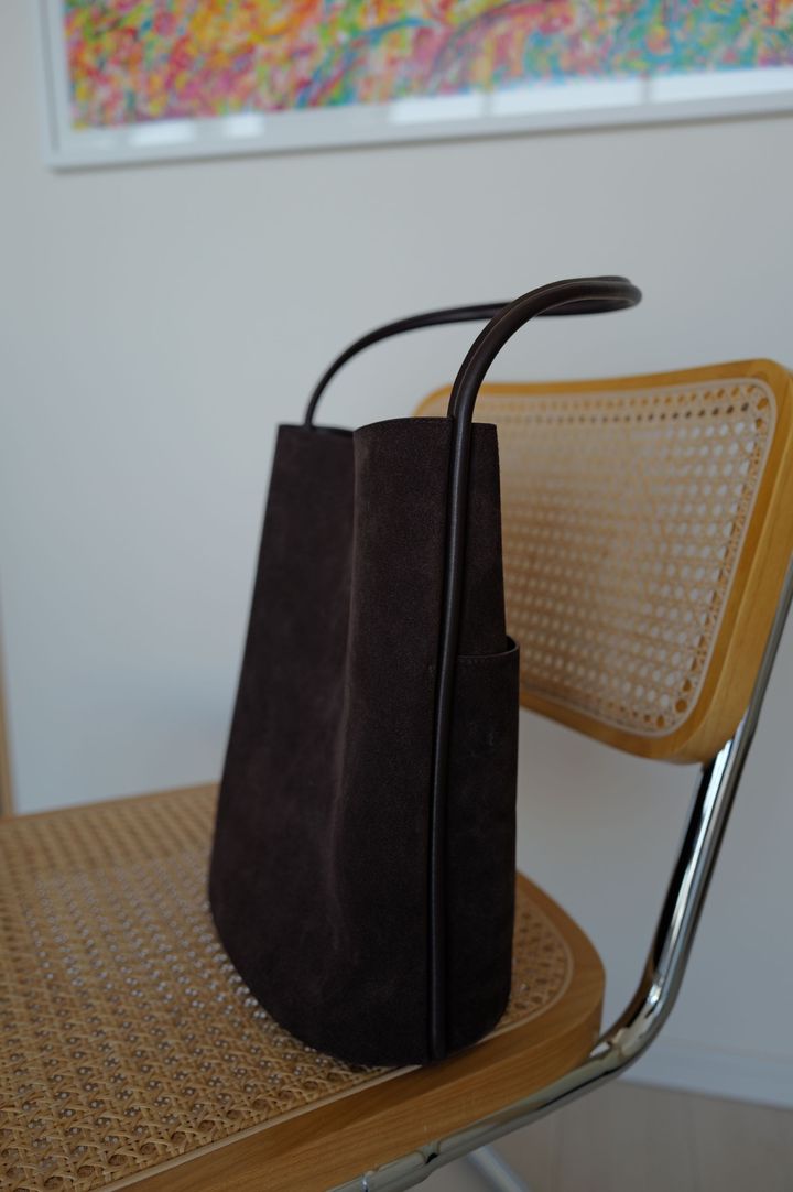 「『ローソウル』のトートバッグは、ミニマルな設計に宿る美しいフォルムと、スエード生地のノーブルな質感がお気に入り。いつも持ち歩いている『ライカ』のカメラも、ケースごと余裕を持って収められます」