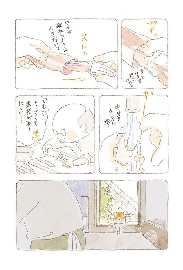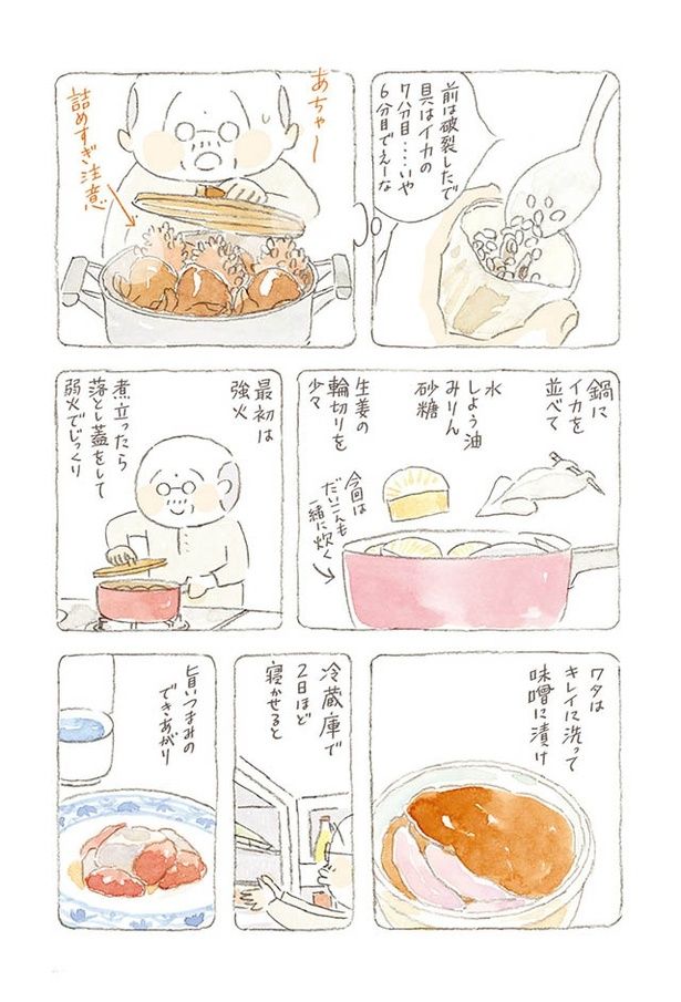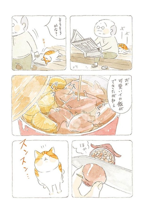 もらったイカを使って料理。小さくて苦戦したものの、かわいい“イカ飯”の出来上がり/ねことじいちゃん7(31)