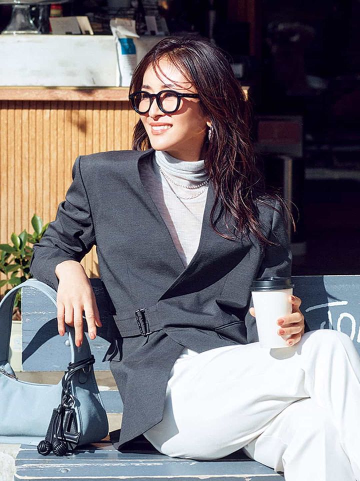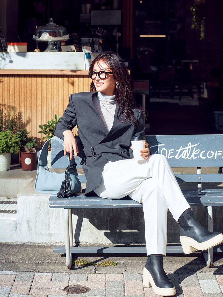 ジャケット¥88,000(ハイク/ボウルズ)ニット¥49,500(ルームエイト/オットデザイン)パンツ¥13,000(PLST)サングラス¥1,990(UNIQLO)ピアス¥73,700(カミーユスロ/オブリオ)ネックレス上¥31,900下¥15,950(ともにココシュニック オンキッチュ/ココシュニック)バッグ¥16,500(リンク)ショートブーツ¥38,500(ハンター/ハンタージャパン カスタマーサービス)
