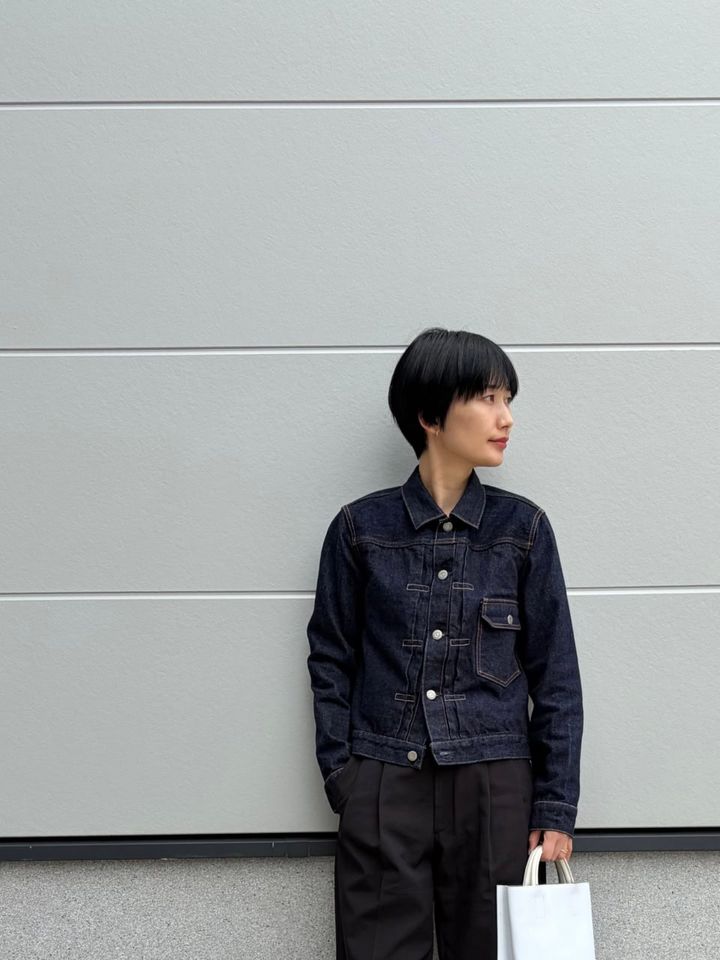 「LENO のデニムジャケットは全サイズ試着し、あえて一番小さいピタピタなサイズを選びました。ヴィンテージデニムジャケットをベースに作られていて、これからガシガシ着て自分スタイルにしていくのが楽しみです」LENOのデニムジャケットは本人私物