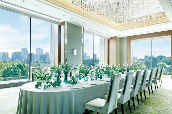 「パレスホテル東京」の貴賓室として設けられた「桔梗」は最高に贅沢な少人数の披露宴ができる会場。2面の窓には、丸の内周辺のビル群と皇居外苑の森という、東京ならではの風景が。特別な料理でのおもてなしや、2泊3日の滞在型ウエディングも忘れられない思い出に。