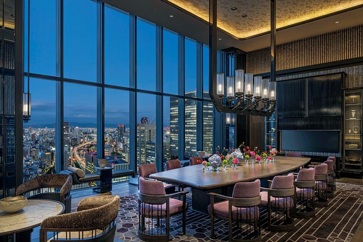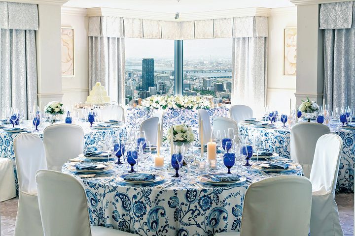 「ザ・リッツ・カールトン大阪」のラグジュアリーなスイートルームがウエディング会場に。バンケットルームとは異なり、ゲスト全員とコミュニケーションを取りやすいのが嬉しい。完全オーダーメイドの料理や会場装飾、宿泊オプションの追加など、自由度の高さも特徴です。窓からの見晴らしのいい景観もきっと話のタネに。