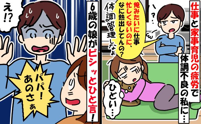自分だってすぐ体調崩すくせに……とモヤモヤしていると、娘が「パパ、なんでそんなひどいこと言うの! ママだってお仕事してるのに、おうちのことも全部してくれてるんだよ」とズバッとひと言。