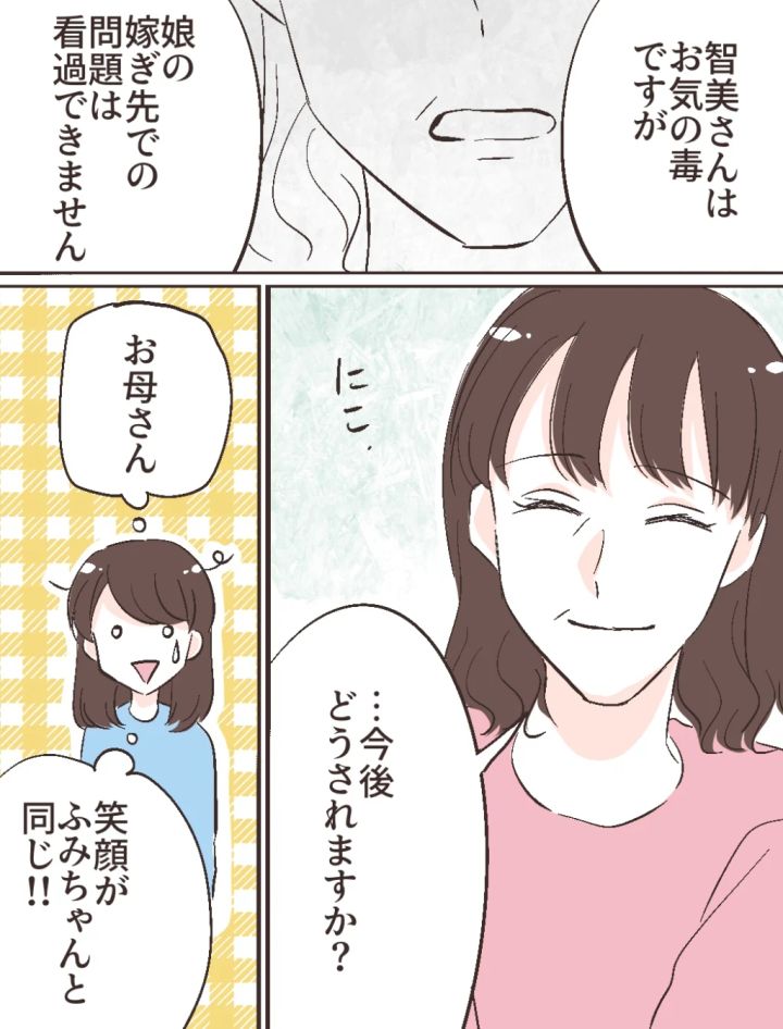 智美さんが父親から離れて自立すべきとは思いつつも、具体的にどうするのが良いのか、これからも智美さんとの関わりは続くのか、はっきり発言できずにいると、お母さんが切り出しました。「智美さんはお気の毒ですが、娘の嫁ぎ先での問題は看過できません。」真顔で、ハッキリと伝えたのです。そして「今後どうされますか?」と、にっこり笑って修吾と義両親に選択を迫りました。有無を言わせないその笑顔・・・ふみちゃんはお母さんのこういうところを引き継いでるんだなと思いました。